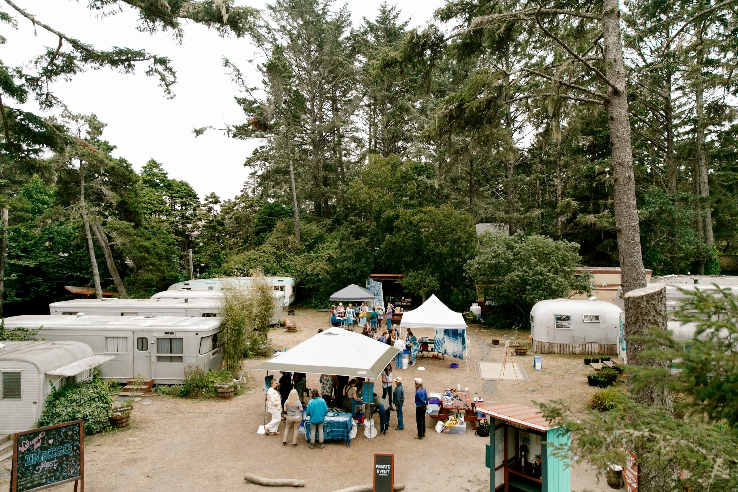 The Sou’wester provides a variety of lodging options from cabins, lodge suites, vintage trailers to campsites/bring your own trailer/RV sites. Situated just blocks from the beach and the Discovery Trail, and only 15 miles from Astoria, Oregon. The Sou’wester is home to Indigofest for one week every August and the ideal for exploring indigo and the natural beauty + bounty of the evergreen coast. The Sou’wester grounds feature fire pits, picnic tables, and inviting outdoor spaces. The three-story lodge features a front porch market curated with a collection of snacks and provisions, local and regional beer and wine, handmade gifts, art and wellness products along with a nostalgic VHS/ Vinyl library. The onsite garden and Finnish sauna will also be available to Indigofest participants during your stay.
